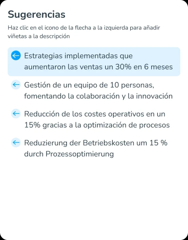 La IA sugiere ideas y ayuda a encontrar las palabras apropiadas para destacar tus logros.
